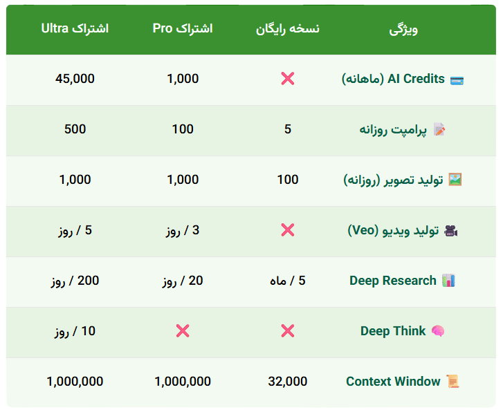 اما نسخه Ultra در واقع بالاترین اشتراک جمینی است با کمترین محدودیت ها، با خرید اشتراک Ultra، به مدل استدلالی Deep Think دسترسی پیدا می کنید، محدودیت تعداد پرامپت روزانه به 500 پرامپت افزایش پیدا خواهد کرد، امکان ساخت روزانه 5 ویدئو با کیفیت 4k خواهید داشت و فضای ابری 30 ترابایتی در اختیار شما خواهد بود.